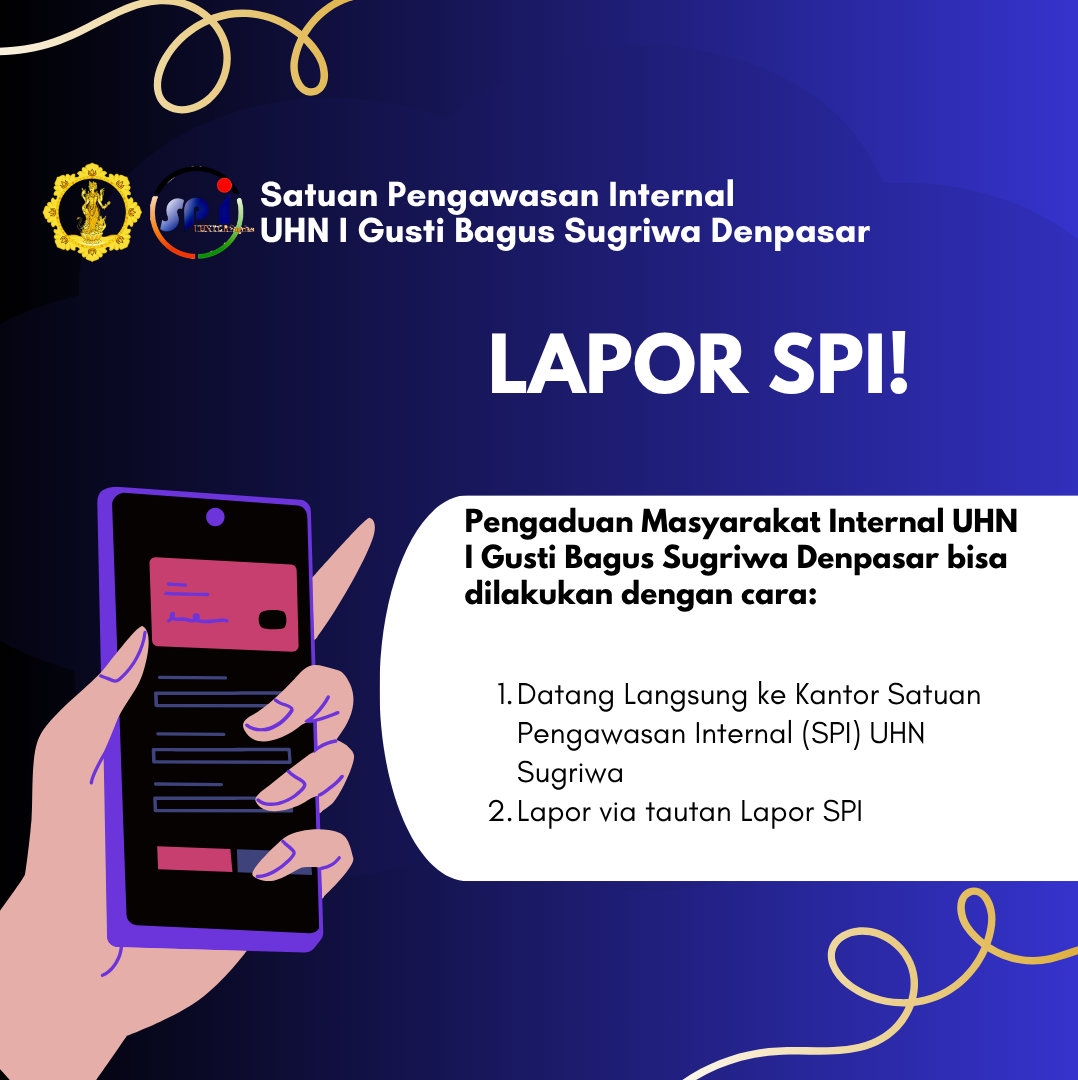 Lapor SPI adalah sarana untuk melaporkan permasalahan yang terjadi di lingkungan UHN I Gusti Bagus Sugriwa Denpasar terkait dengan pengawasan bidang keuangan, pengadaan barang jasa, pemanfaatan aset, SDM, serta segala hal yang berhubungan dengan pengawasan non akademik. Laporan akan kami tidak lanjuti apabila disertai dengan bukti yang cukup dan memadai